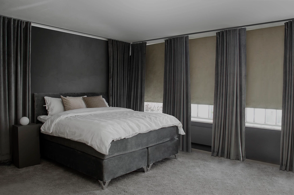 På samma sätt blir en svart skena en naturlig del av helheten när det gäller mörka färgval på gardinerna. För att förstärka den effekten ytterligare, används bara en så lång skena som gardinens bredd – något som ger ett harmoniskt uttryck till helheten även när du sätter en svart skena på ett vitt tak. På så sätt skapas även en illusion att gardinen går hela vägen upp till taket – även i de fall där det är ett mellanrum mellan gardin och tak.