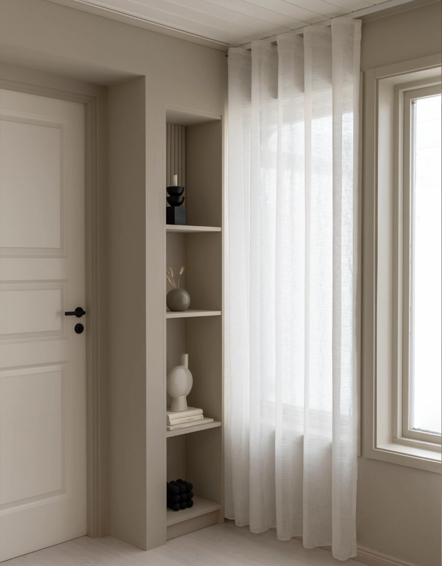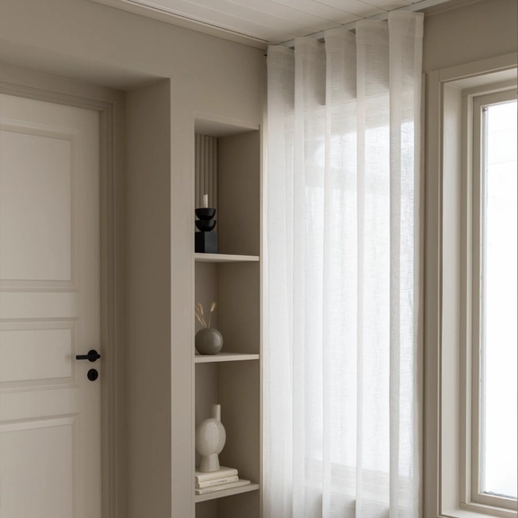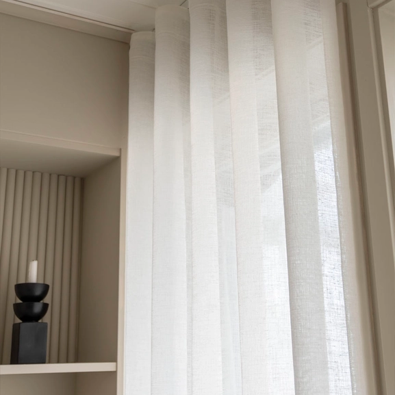 - Kan hängas på stång/i skena med rynkbandskrok för perfekta hotellvågor eller fingerkrok för fina veck