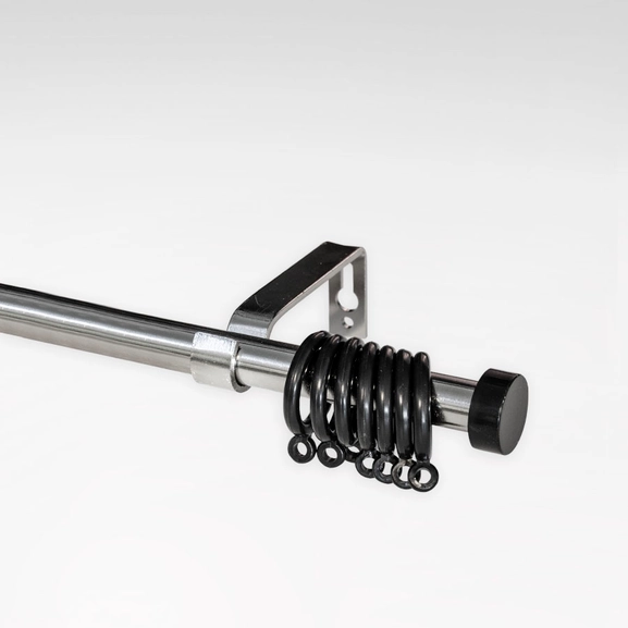 Gardinstången i stål har ringar med clips. Svart och antikmässing har med ögla.