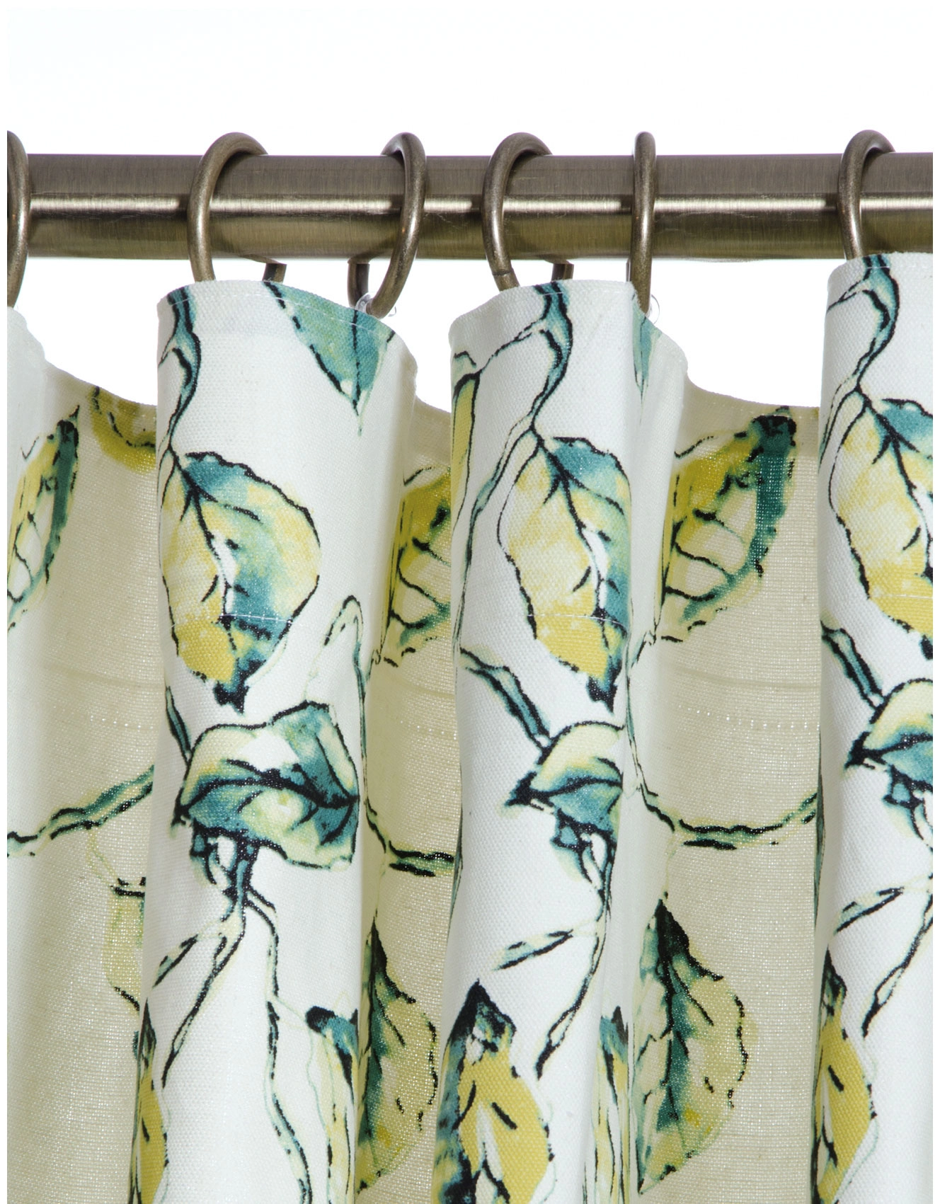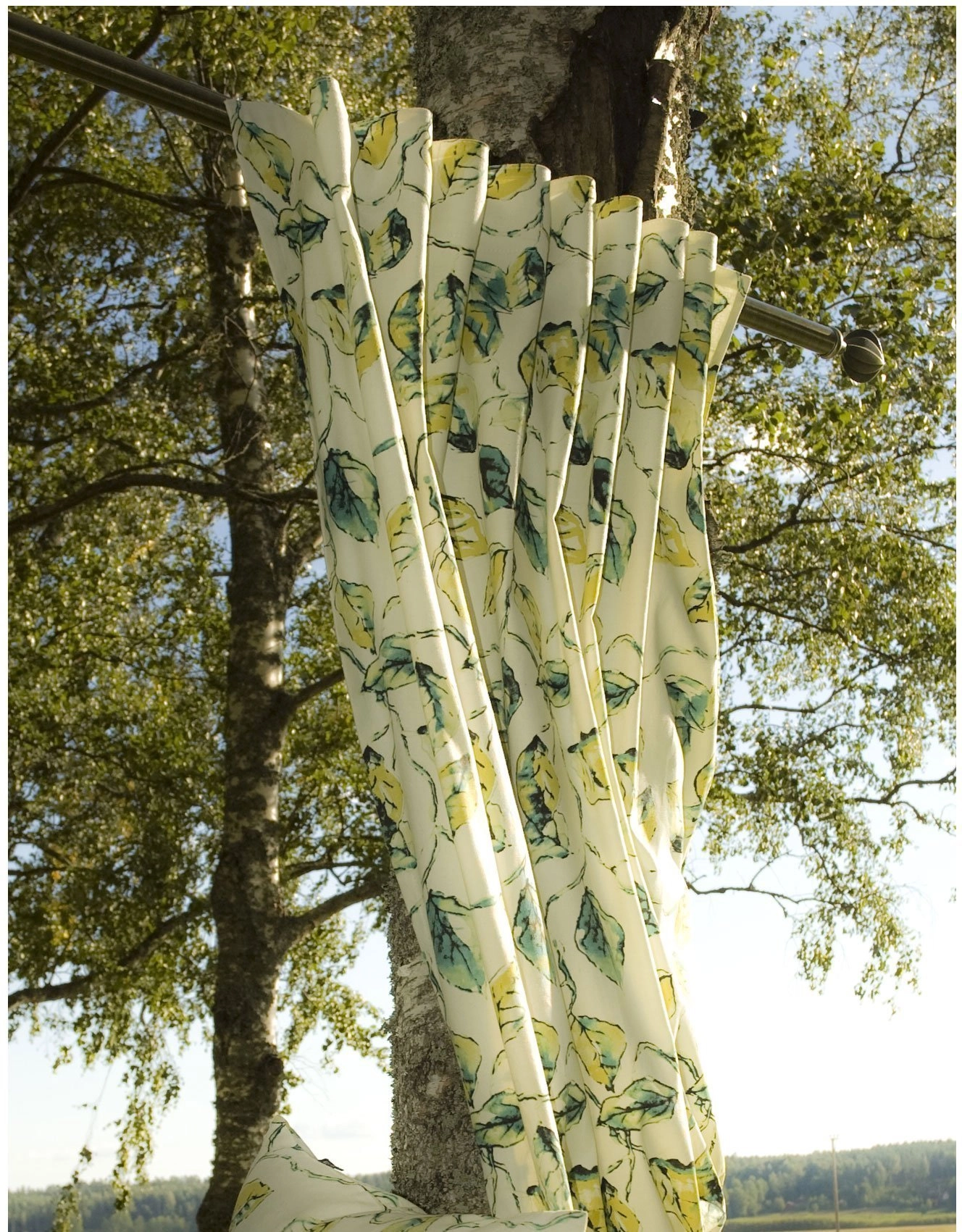 Gardin i handmålat bladmönster. 100% bomull. Finns även i matchande kudde och hissgardin. Gardinen har Hastas multigardinband, vilket betyder att du kan sätta upp gardinen på 4 olika sätt. Direkt på stången i hällor, med rynkband (köp till rynkbandskrok), fyrfingerkrok eller wave-upphängning (köp till nålkrok).