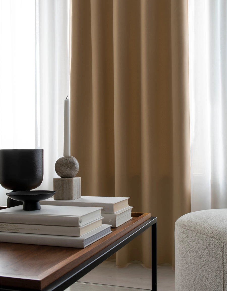 Gardin i ett mörkläggande, tjockt tyg. Tyget har en vacker glans. Observera att en gardin utan mörkläggningsskikt aldrig kan stänga ute 100% av ljuset, utan endast förmörkar rummet och stänger ute det mesta av ljuset.